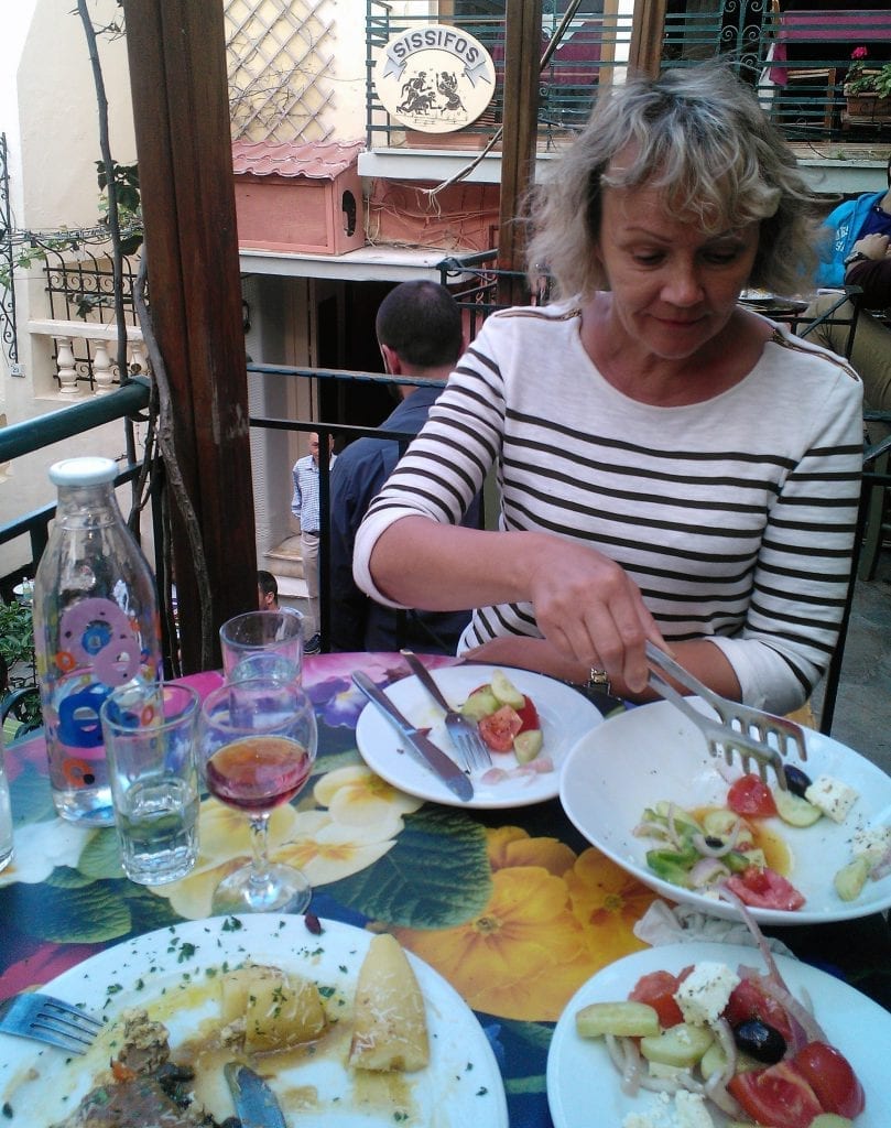 Päädyimme viehättävään Sissifos Tavernaan. Se sijaitsee portaiden yläpäässä ylisuosittujen ravintoloiden/kahviloiden ylimmässä osastossa, hieman rauhassa valtavan puheensorinan täyttämästä pääkadusta. Hyvä ja edullinen paikka, jossa viininlehtikäärylöihin kääritty yli 5 tuntia padassa muhitettu yrttimausteinen lammas ja fetajuusto oli erinomainen valinta 10,80 euron hintaan. Marjatta otti jo perinteeksi muodostuneen salaatin, nyt kreikkalaisen. Hyvää olivat molemmat. Hinta juomineen yhteensä 23 euroa. Ilta alkoi pimentyä, joten kiirehdimme metroon ja kämpille naatiskelemaan huoneistostamme. Siinä se ilta sitten menikin upean kirjoituspöydän ääressä kuvia luokitellen ja tiistain koulutuspäivää suunnitellessa.