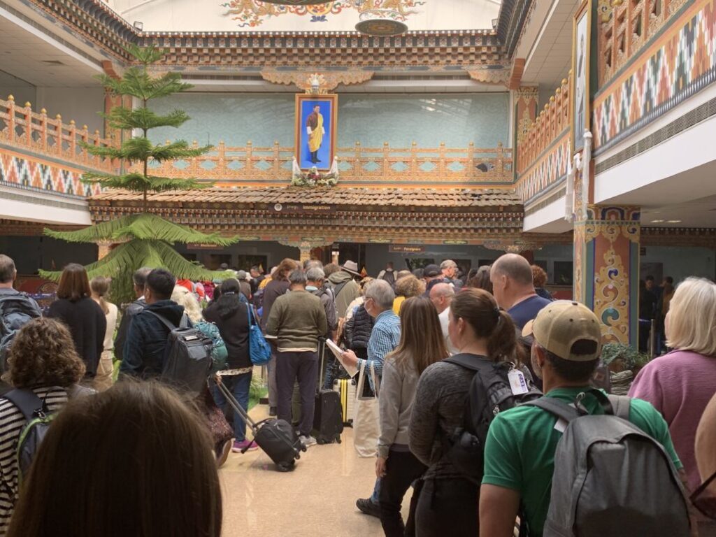 Saavun ovesta sisään ja koen alusta lähtien mielettömän lämpimän vastaanoton. Bhutanilaiset virkailijat ovat todella lempeitä eteenpäin ohjatessaan ja passeja tarkastaessaan. Jonossa odottaessani joku virkailija tulee kysymään vuorotellen jonottavilta, mistä päin he ovat tulossa ja mitä he tulevat Bhutaniin tekemään. Kysymykset eivät ole painostavia, vaan lempeitä – lähes stand-up koomikon asettamia vitsailevia kysymyksiä.