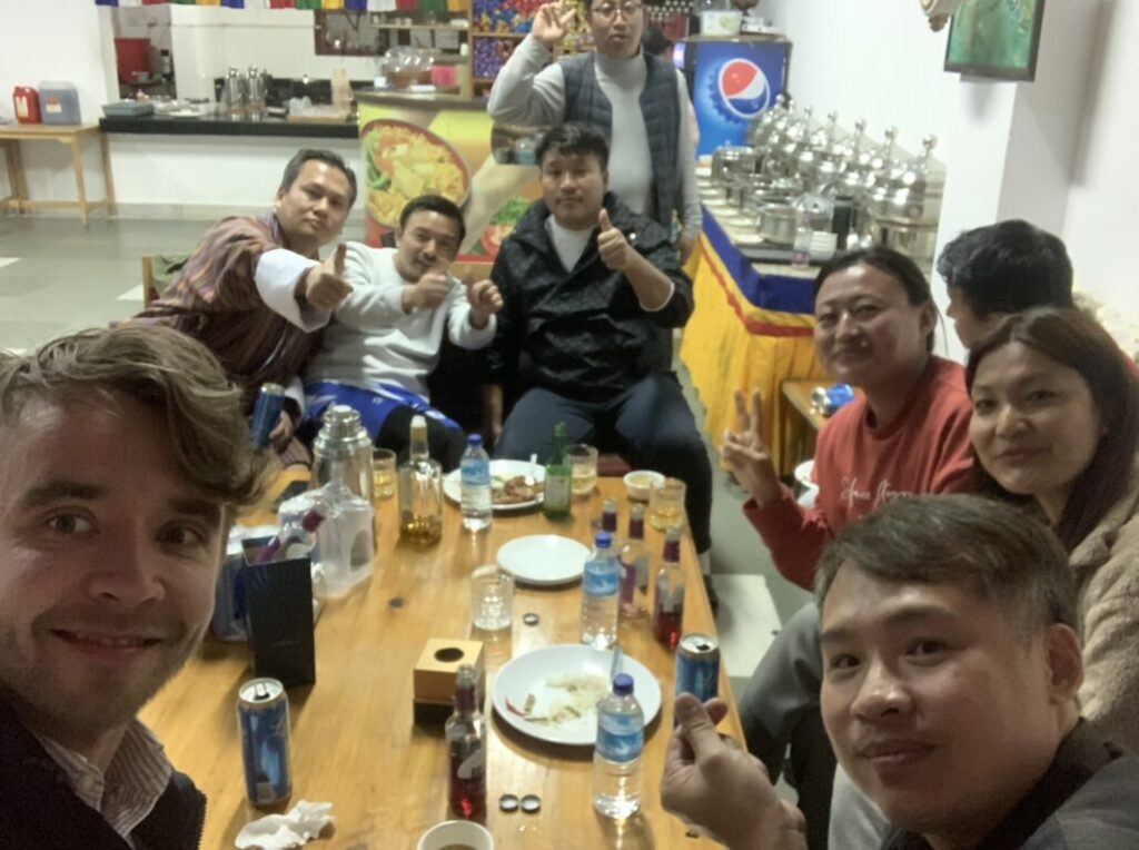 Pelit loppuivat yhteisiin ruokailuhetkiin, joissa lyhyesti kerrattiin matsin tilanteet hyvässä mielessä naureskellen ja käytiin läpi seuraavan päivän opetusta. Kenties tällaisessa käytöksessä näkyy elementtejä sille onnellisuuden tunteelle, josta bhutanilaiset tunnetaan?