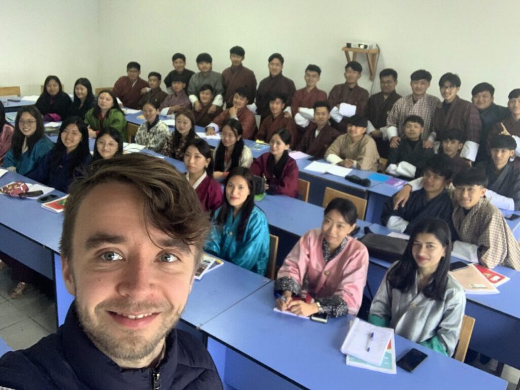 Aloitin lähes jokaisen oppituntini kertomalla lyhyesti itsestäni ja sen jälkeen pyysin opiskelijoita kokemuksellisen oppimisen teorian mukaisesti lyhyesti keskustelemaan pareittain, mitä he tietävät Suomesta. Bhutanilaiset opiskelijat osaavat yllättävän hyvin englantia ja he osoittavatkin tietämystään hienosti. Monet heistä tiesivät, että Suomi on tuhansien järvien maa, jotkut tunsivat joulupukin ja lähes kaikki heistä tiesivät, että Suomi on maailman onnellisin maa.
