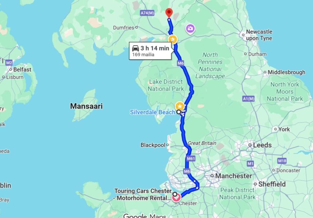 Meitä oli varoiteltu siitä, että Englannissa puskaparkit (eli levähdyspaikat joissa saa yöpyä) ovat todella kortilla. Pysähdysalueita kyllä löytyy, mutta useimmissa niissä on yöpyminen kielletty eli tässä mielessä Englanti poikkeaa selkeästi aiemmista kokemuksistamme Suomessa, Ruotsissa ja Norjassa sekä nyt Skotlannissa. Nyt sellainen löytyi vasta Silverdale Beachin läheltä lähes tuskaisan etsimisen jälkeen.