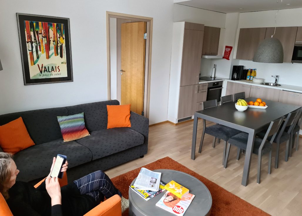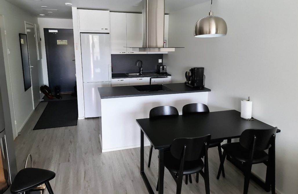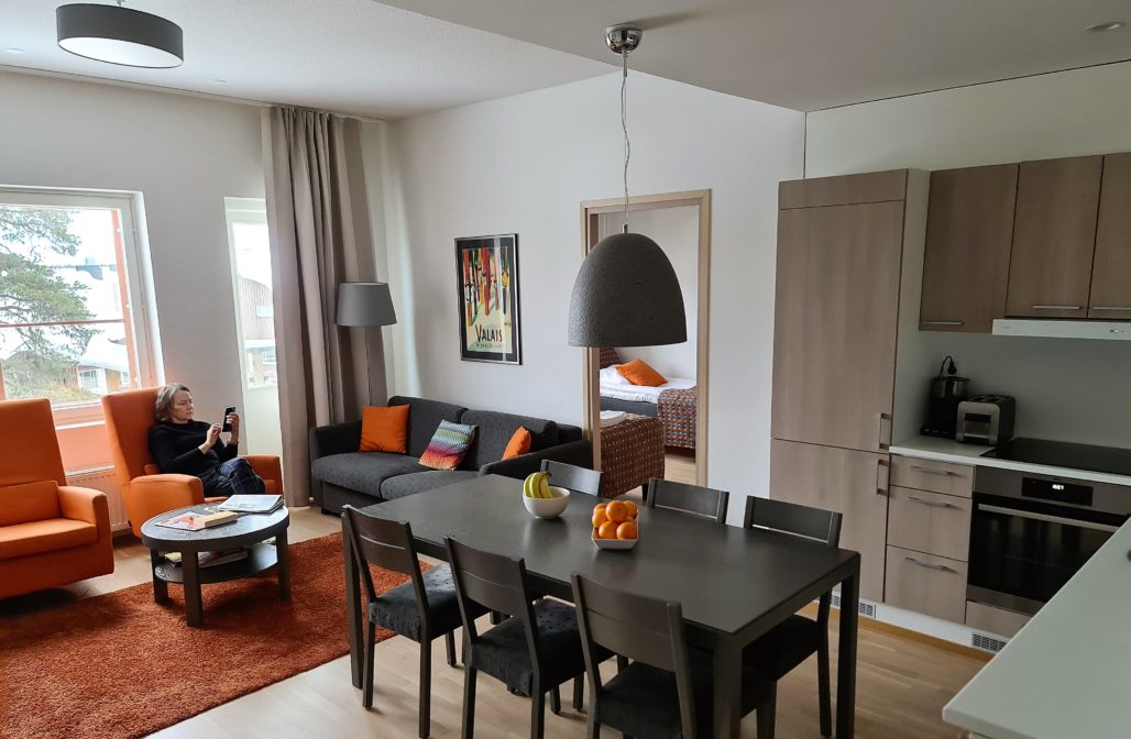Kiireinen hotellinjohtaja tarjosi mukavan rupatteluhetken lisäksi mahdollisuuden vilkaista alueen uusinta huoneistoa. Pääsimme katsomaan juuri vapautunutta 2 mh huoneistoa maaliskuussa 2020 valmistuneessa Villas-asunnossa.