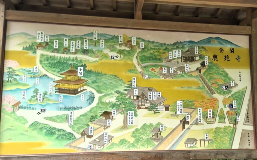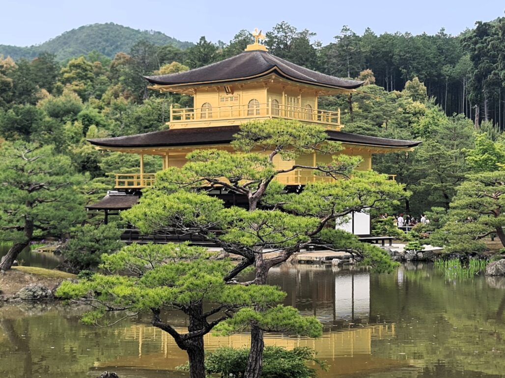 ”Kinkaku-ji (金閣寺; japanilainen ääntäminen: [kjiꜜŋ.ka.kɯ.dʑi],[2][3] kirjaimellisesti ’Kultaisen paviljongin temppeli’’), virallisesti nimeltään Rokuon-ji (鹿苑寺; [ɾoꜜ.kɯ.oɲ.dʑi],[2] kirjaimellisesti ’Peurapuutarhatemppeli’), on zen-buddhalainen temppeli Kiotossa, Japanissa ja matkailukohde. [4] Se on nimetty maailmanperintökohteeksi, kansalliseksi erityiseksi historialliseksi kohteeksi, kansalliseksi erityismaisemaksi sekä yhdeksi muinaisen Kioton 17 historiallisesta monumentista. [5] Temppeli on saanut lempinimensä reliikkivarastostaan (shariden), Kultaisesta paviljongista (金閣, Kinkaku), jonka kaksi ylintä kerrosta on päällystetty 0,5 μm kultalehdellä. Nykyinen paviljonki rakennettiin uudelleen vuonna 1955 tuhopolton jälkeen.” (Wikipedia)