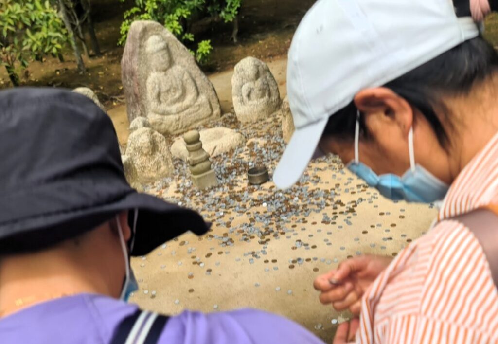 Temppelialueelle oli kehitetty hyvä tapa saada vierailijat luopumaan pienistä (lähes arvottomista) kolikoista. Jokainen tykkää pienistä haasteista. Sellainen oli tällä kertaa tarkkuusheitto. Olisihan se mahtavaa saada kolikko jäämään kuppiin! Kovin harva siihen pystyi 🙂