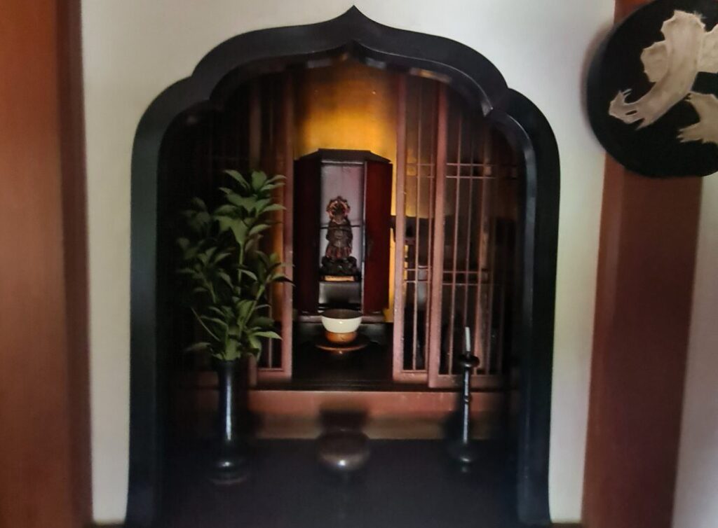 Yllä olevassa kuvassa tumma, koristeellinen kaari kehystää tokonomaa, korostaen sen pyhyyttä ja erillisyyttä muusta tilasta. Puinen säleikkötausta tuo tilaan lämpöä ja perinteistä japanilaista tunnelmaa, jossa puu ja paperi ovat keskeisiä materiaaleja. Valaistus on pehmeä ja kohdistettu patsaan ympärille, mikä luo meditatiivisen ja kunnioittavan ilmapiirin. Tämä ei ole vain sisustuselementti, vaan henkinen keskus kodissa tai temppelissä.