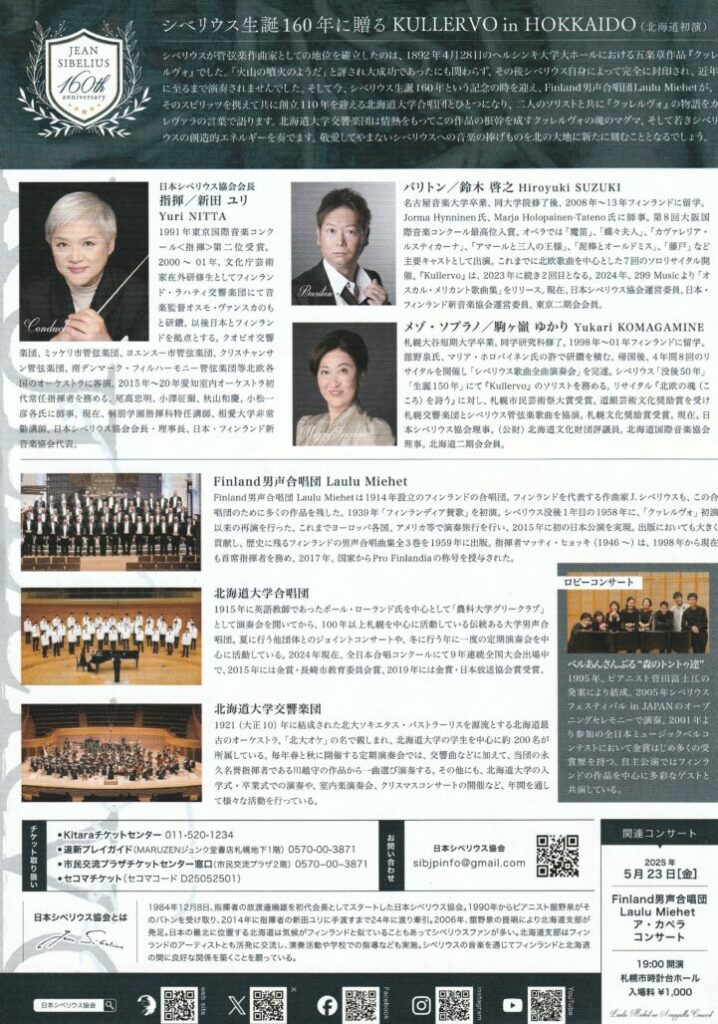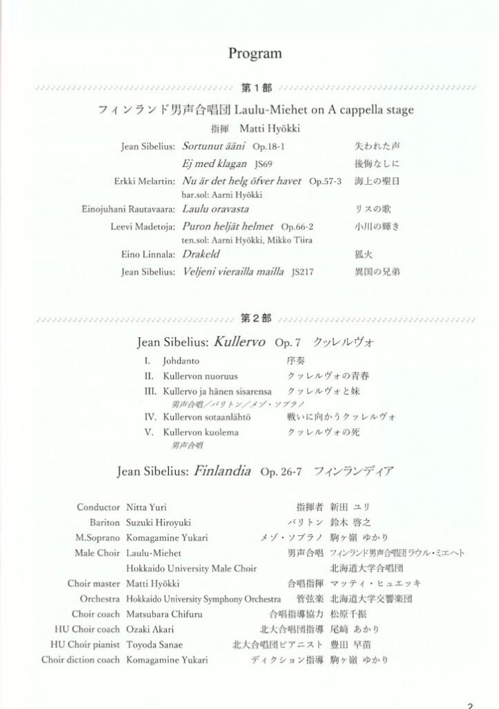 Upeassa Sapporon Kitara-konserttisalissa lauletun Kullervo-sinfonian ja Finlandian johti Japanin Sibelius-Seuran puheenjohtaja, kapellimestari Yuri Nitta. Konsertin aluksi Laulu-Miehet esitti Matti Hyökin johdolla omassa a cappella -osuudessaan valikoiman suomalaisten säveltäjien mieskuoroteoksia (Sibelius, Madetoja, Melartin, Linnala, Rautavaara). Paikallinen media kuvaili Laulu-Miesten esittämiä teoksia upeiksi: ”Suomalaisen musiikkineron musiikki oli todella vakuuttavaa”. Laulu-Miehet