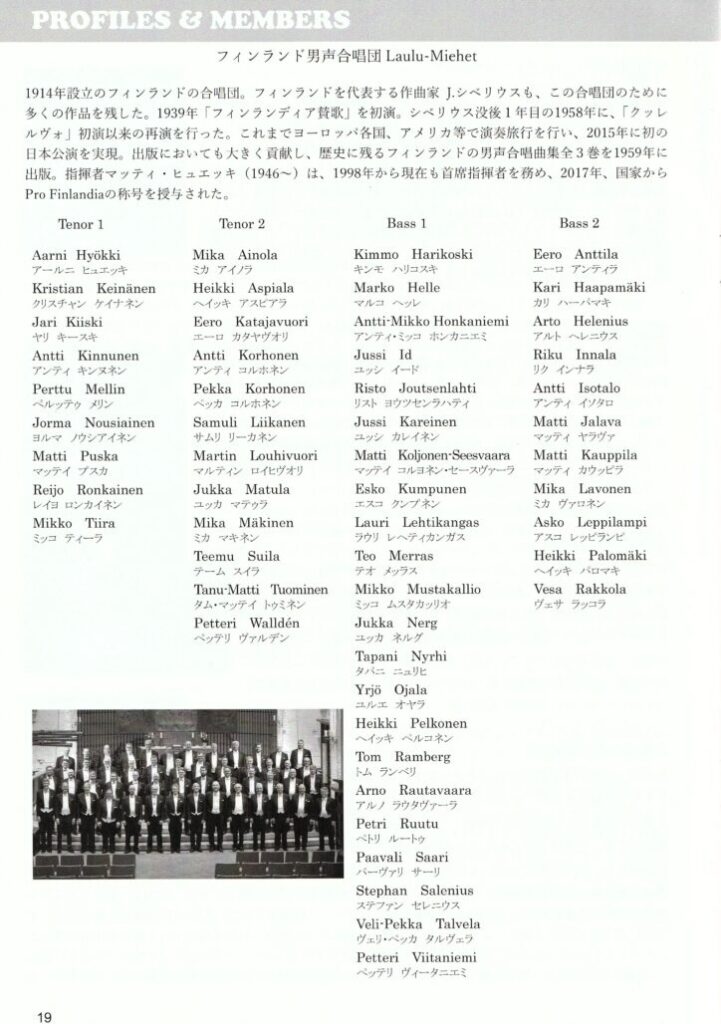 ”Laulu-Miehet järjesti Sapporossa myös oman a cappella -konsertin, jossa esiteltiin laajasti suomalaisten säveltäjien suomen- ja ruotsinkielistä musiikkia kolmelta aikakaudelta. Perusteeman ”1890-” säveltäjät olivat ikoniset Jean Sibelius, Toivo Kuula, Leevi Madetoja ja Selim Palmgren. Toisen osan ”1920-” säveltäjinä kuultiin Erkki Melartinia, Eino Linnalaa ja Erik Fordellia. Kolmas osa ”1980-” päätti konsertin aikalaistemme Einojuhani Rautavaaran, Baron von Klumpenfrau -nimimerkin, Mikko Heiniön ja Mikko Sidoroffin sävelin. Sidoroffin Vanhurskaan Simeonin kiitosvirsi oli kantaesitys.” Laulu-Miehet