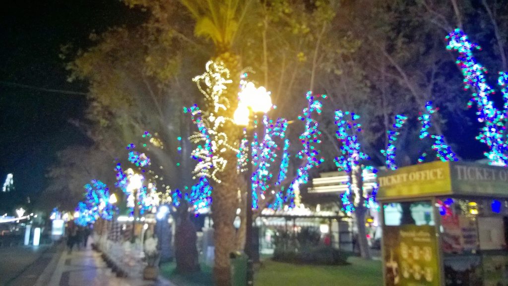 Rantakadun puut oli valaistu runsain, monivärisin valomuodostelmin, mutta tällaisesta kuvasta kokonaisuus ei hahmotu juurikaan.