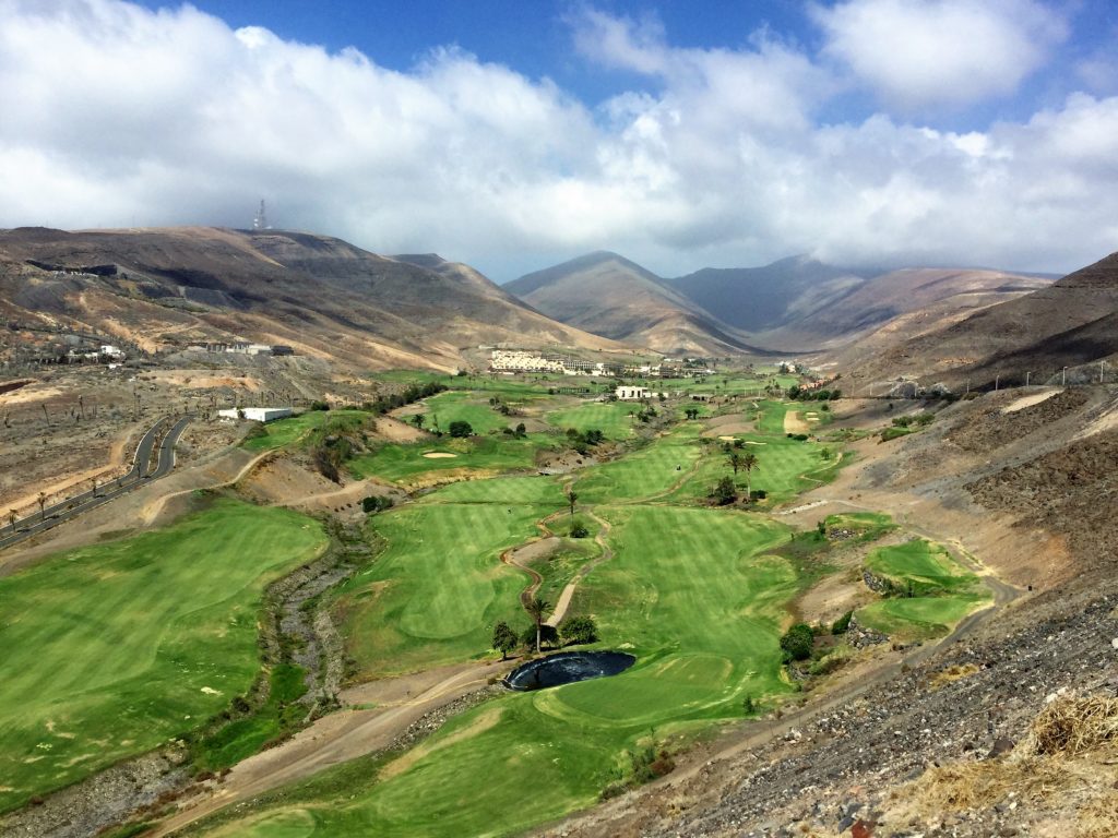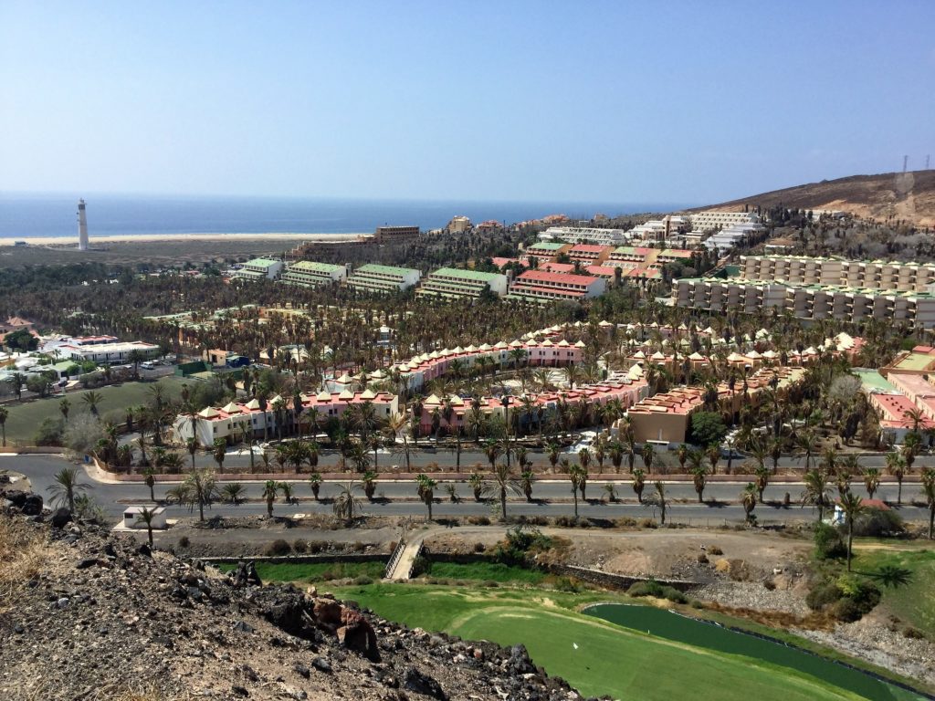 Hotellimme näkyy golfkentän takana keskellä, vaalea iso rakennus.