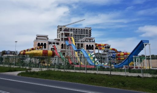 Tien toisella puolella on valtaista vesipuisto ja sen takana rakenteilla oleva hotelli. Saas nähdä valmistuuko se koskaan?