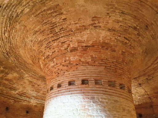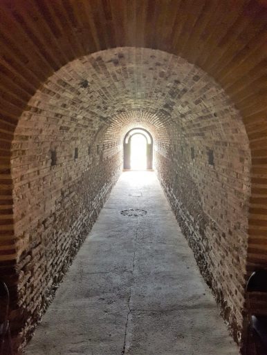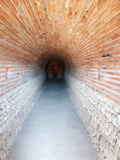 Ovi johtaa pitkään tiilivuorattuun käytävään.
