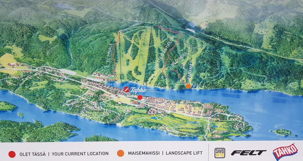 Pyörittelimme silmiämme ajaessamme Tahkolle noin 15 vuoden tauon jälkeen. Siellä on majoituskapasiteettiä vallan ”hirveästi”. Joka puolelle on noussut loma-asuntoja. Olimme saapuneet lomakylään. Tämänkertainen huoneistomme sijaitsee yllä olevassa piirroksessa punaisen pisteen alapuolella eli erittäin keskeisellä paikalla.